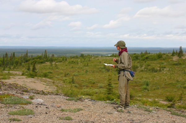 — Erin studying the map and the view from the "exposed rock hills" near the Kvichak River.
