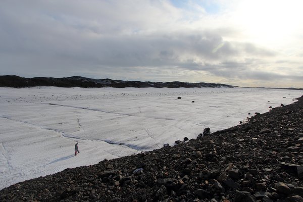 Between high hills of ice insulated by rock, stripes of smooth white ice provided the easiest traveling of the whole trip.