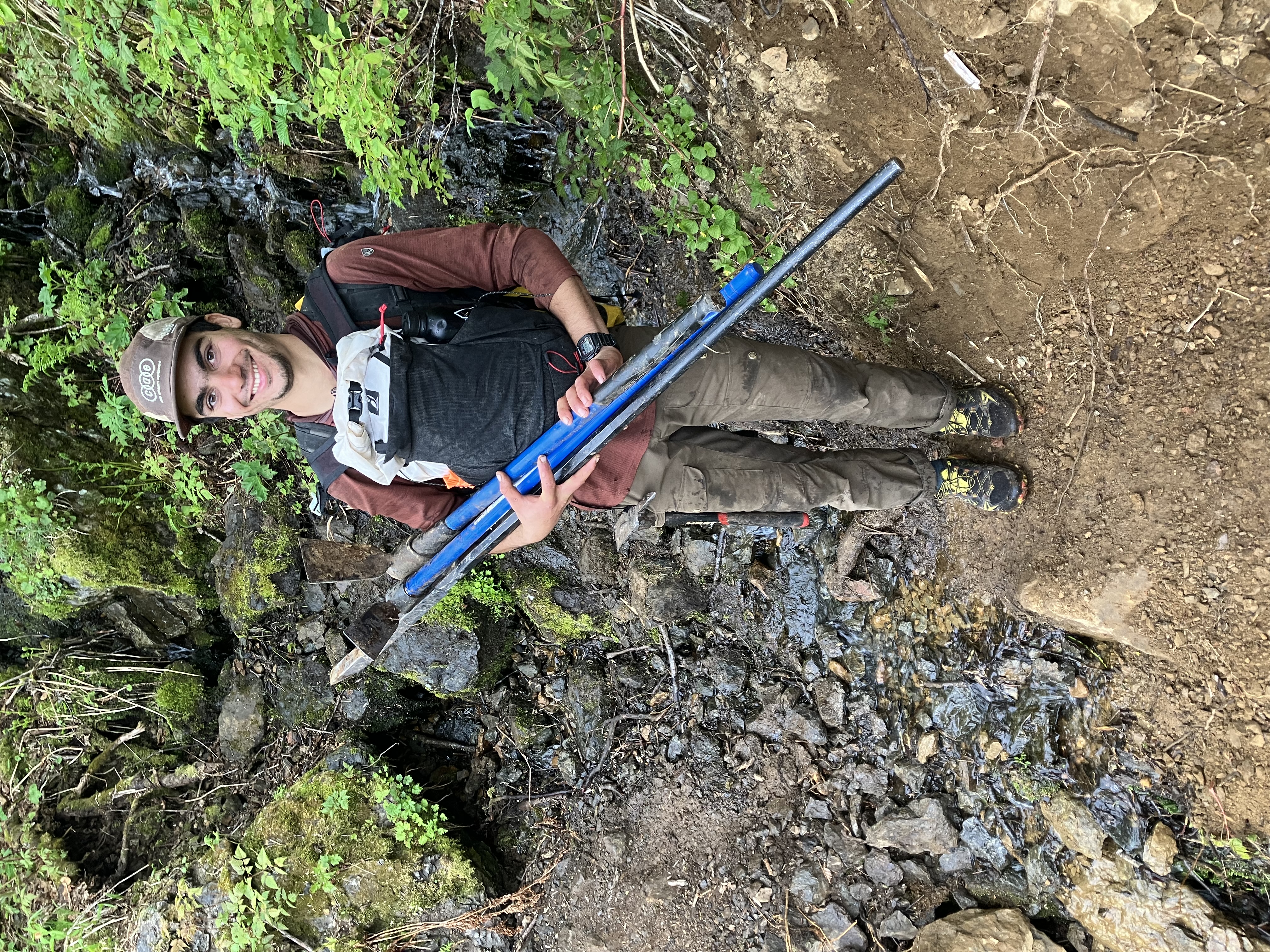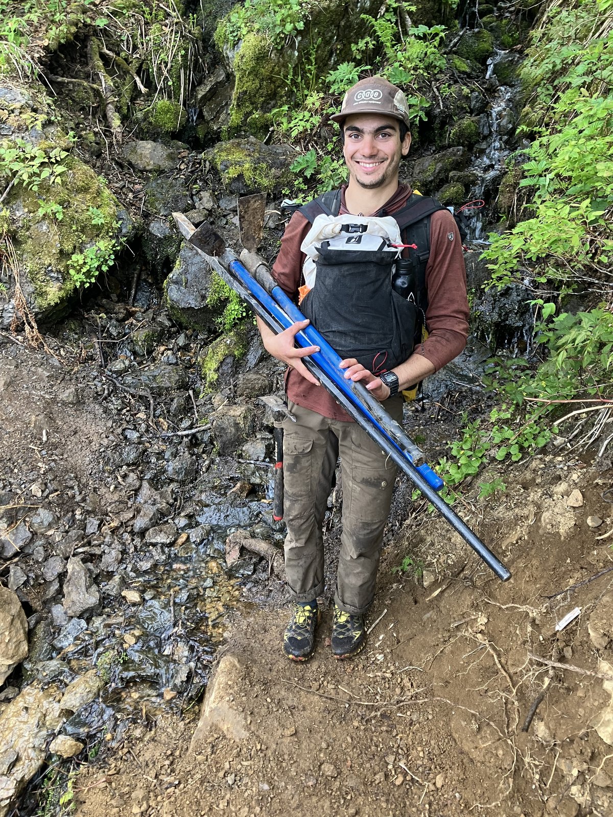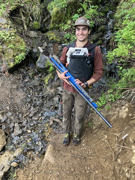 — Krishna holding a bunch of trail tools, a 'normal' day as Hig's intern