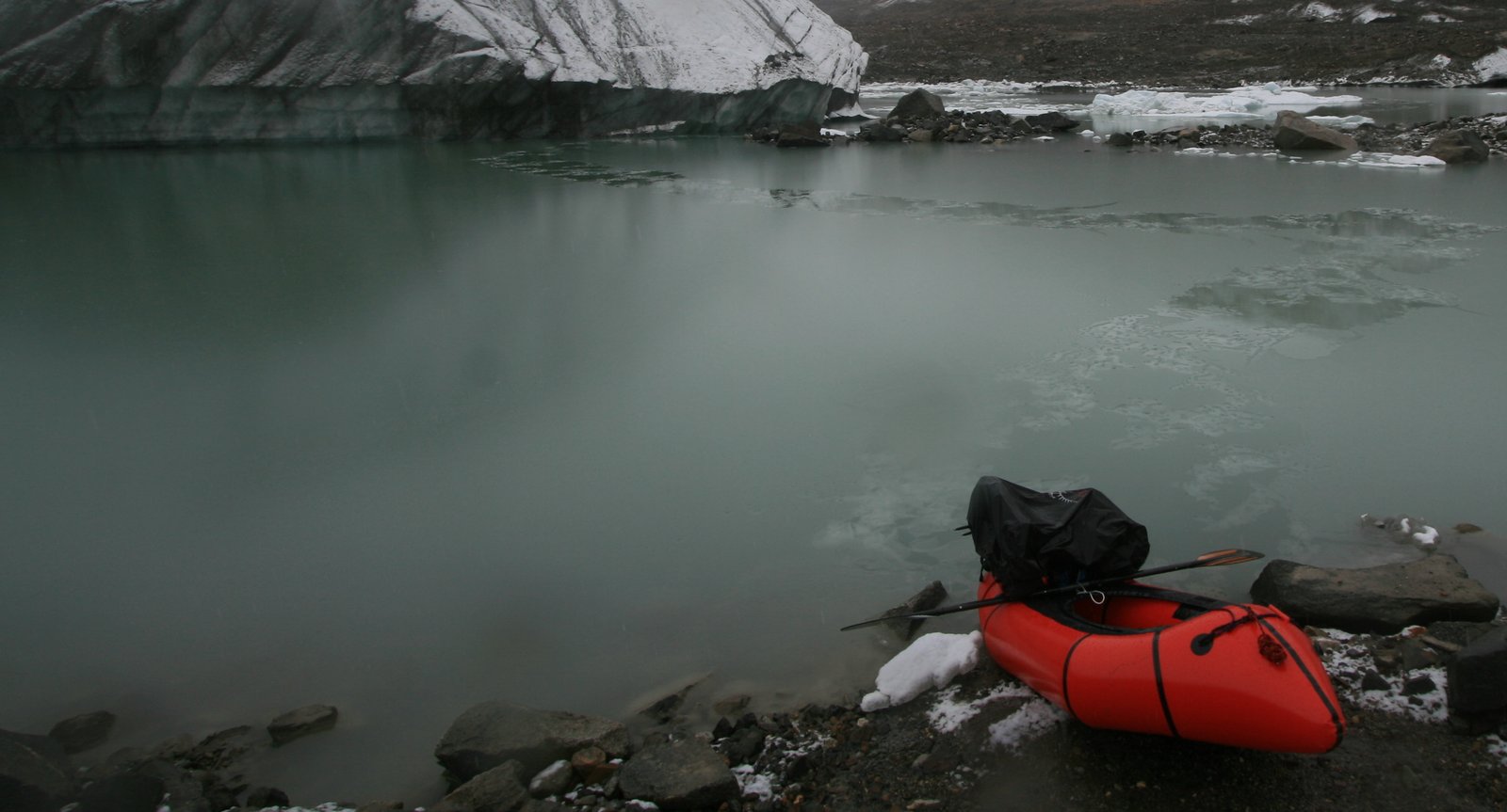 Packraft and remnant track through slush, dwarfed by glacial ice (close-up)