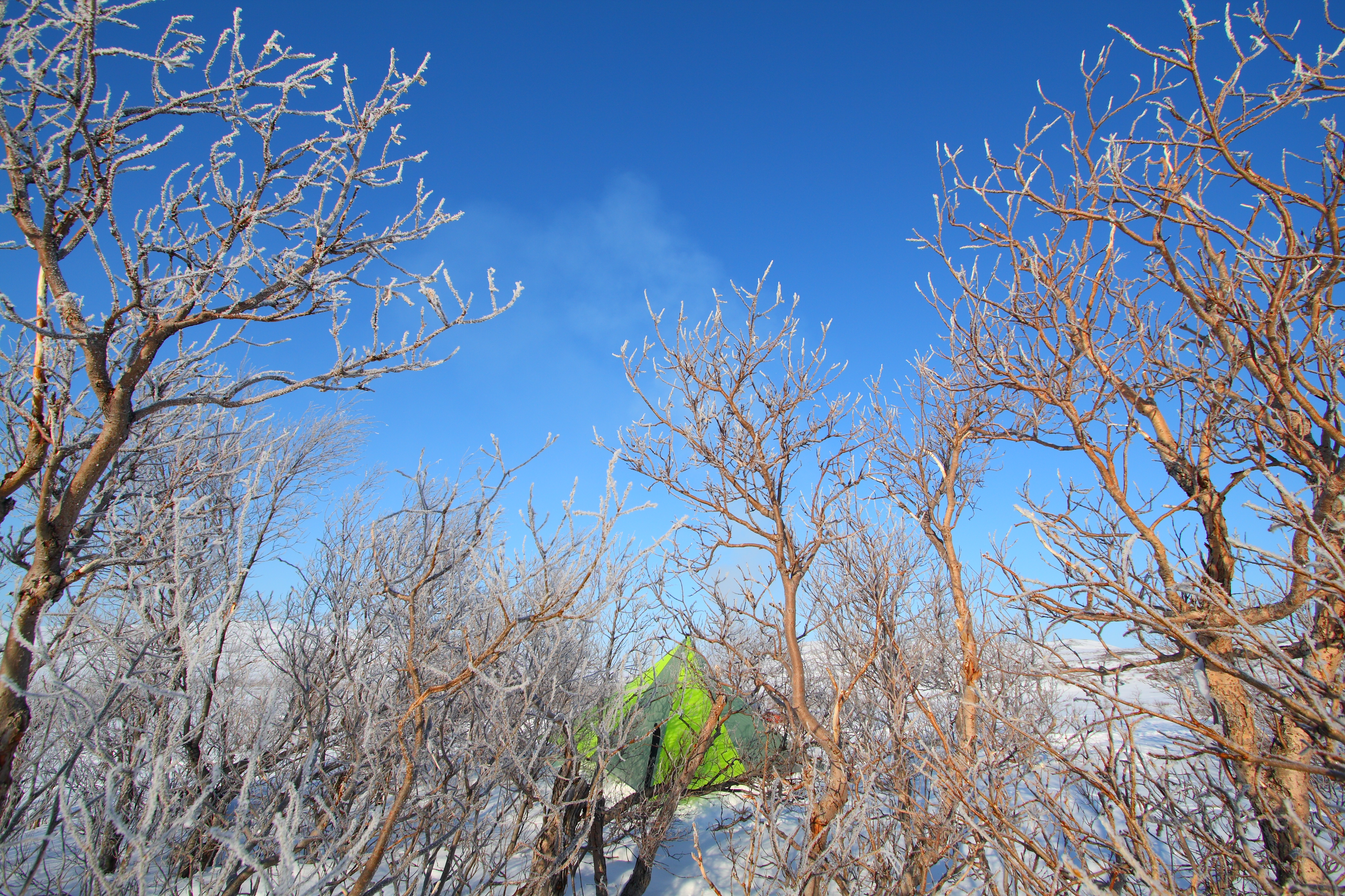 Even in the snow, we use a floorless shelter, sleeping on a thin sheet of foam with inflatable pads on top.