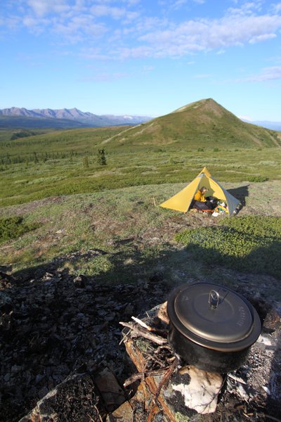 — A titanium cookpot on a small campfire cooks most of our meals.
