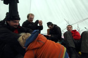 — 2 kids and 7 adults, weathering driving rain by the fire in our Titanium Goat tent.
