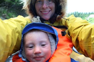 Erin and Katmai enjoy the break as Hig paddles the packraft