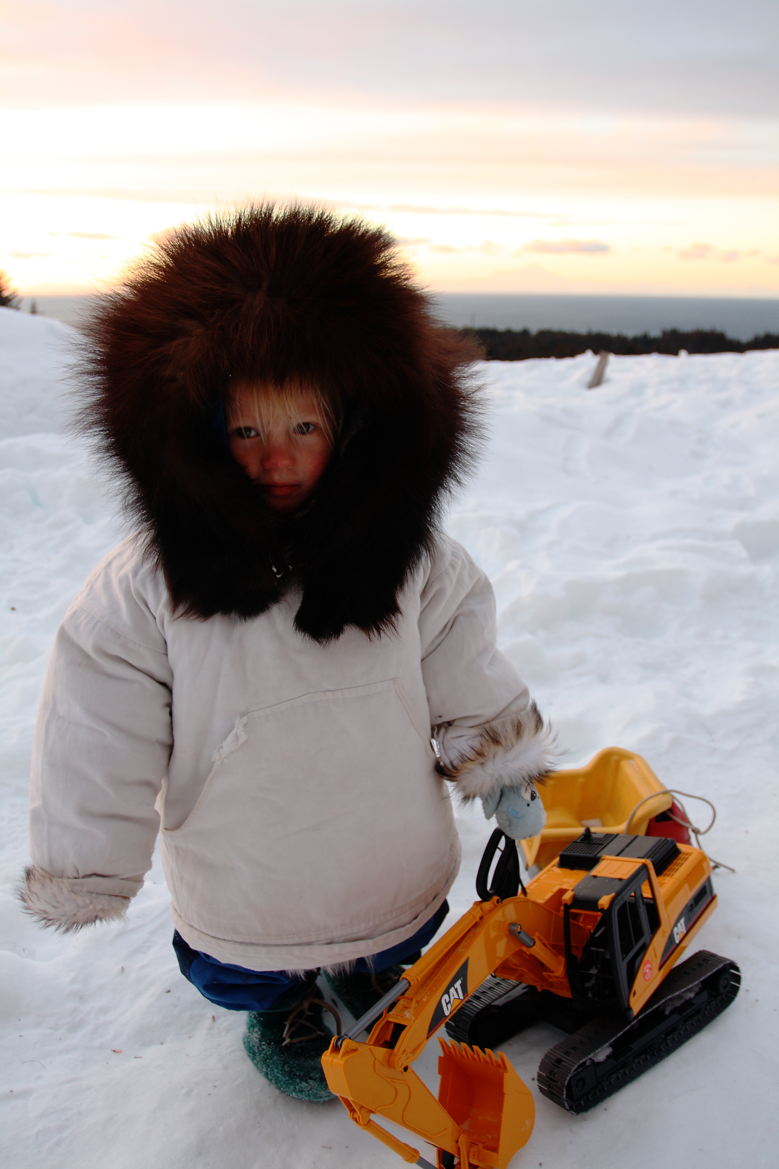 — A generous gift from Point Hope, Katmai's parka lets him enjoy his new backhoe on a cold windy day