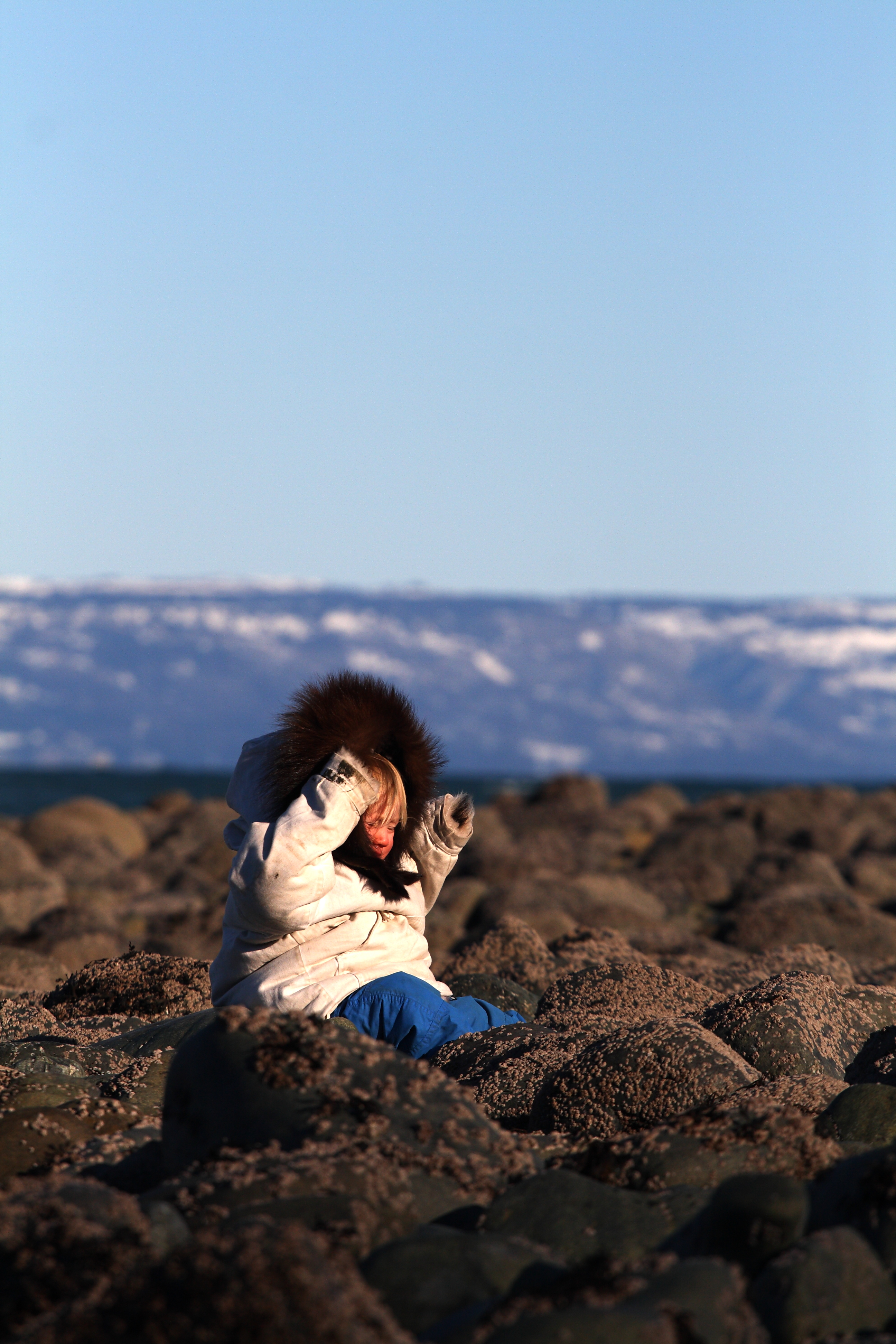 — Nearly too dressed up to move, Katmai plops down on barnacle-covered rocks