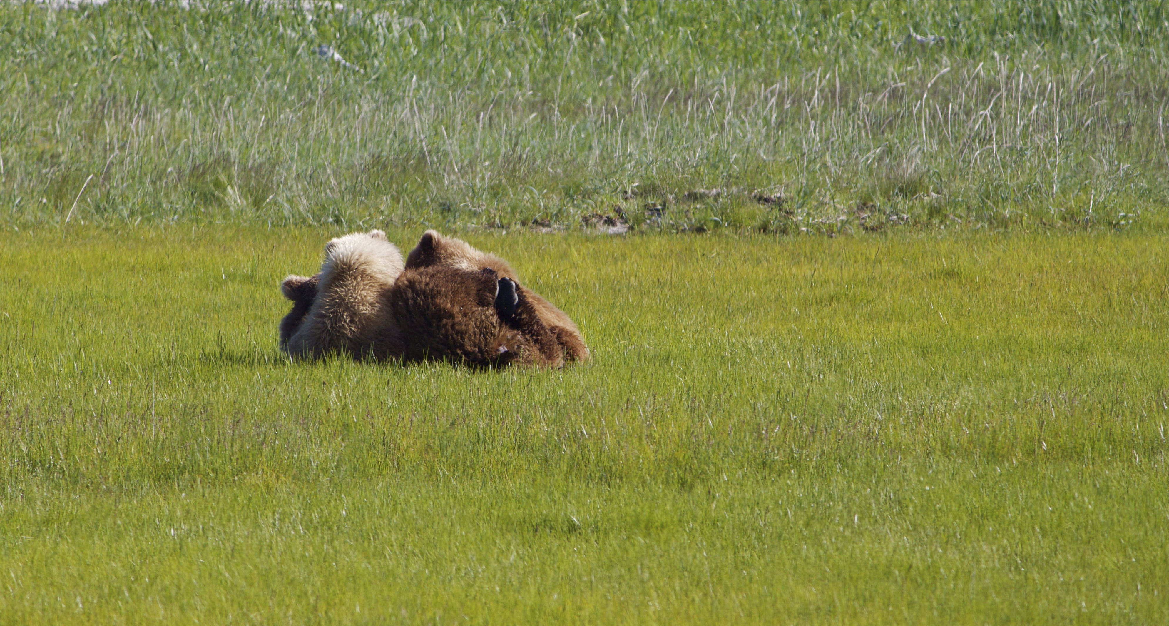 — These two year old cubs are able to graze on sedge and eat salmon the sow catches for them, but they still nurse many times a day. The sow will rear the cubs for two to three years before she chases them off and mates again.