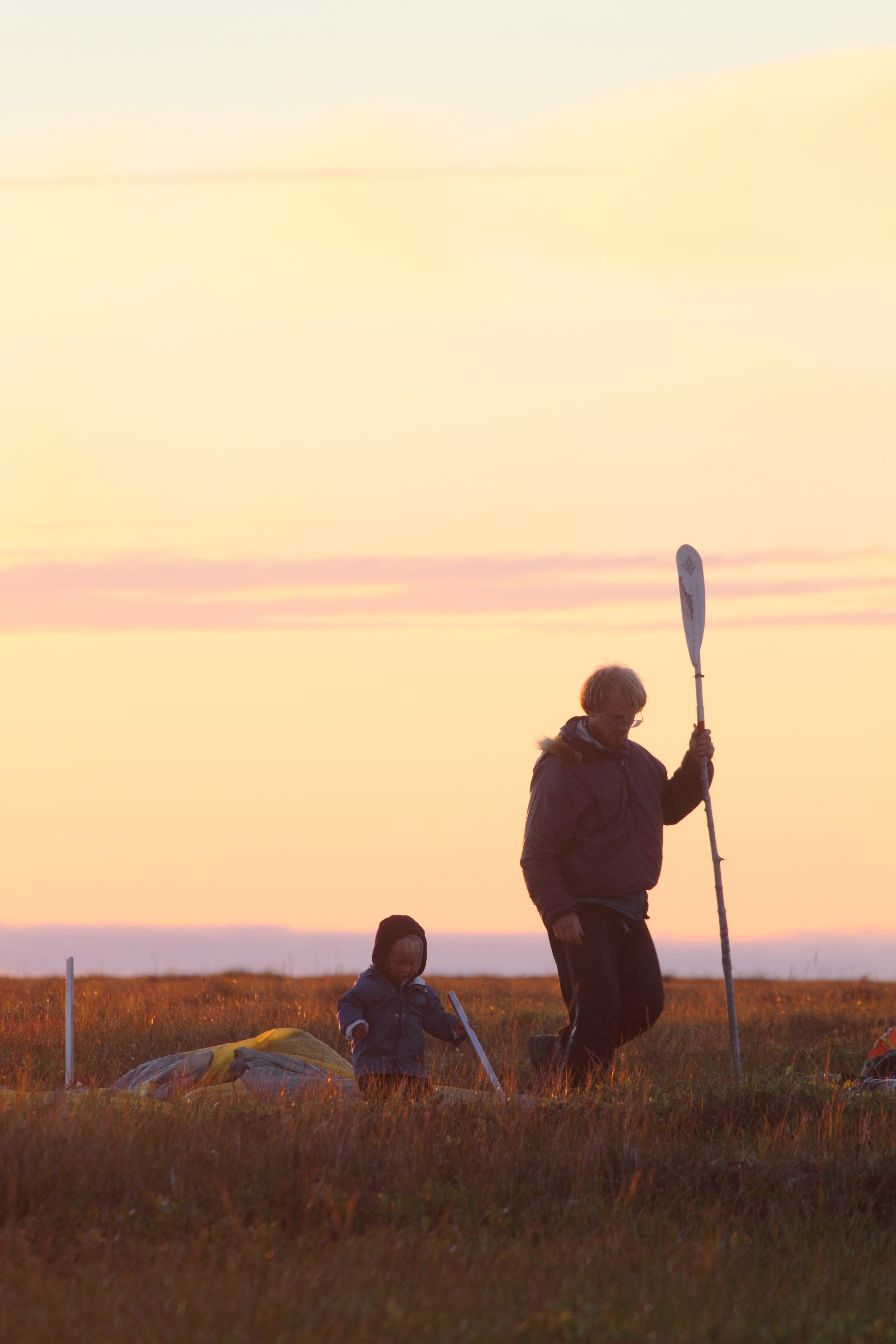 — The packraft paddle is used as the center pole that gives structure to our shelter. Found sticks and rocks serve as stakes.