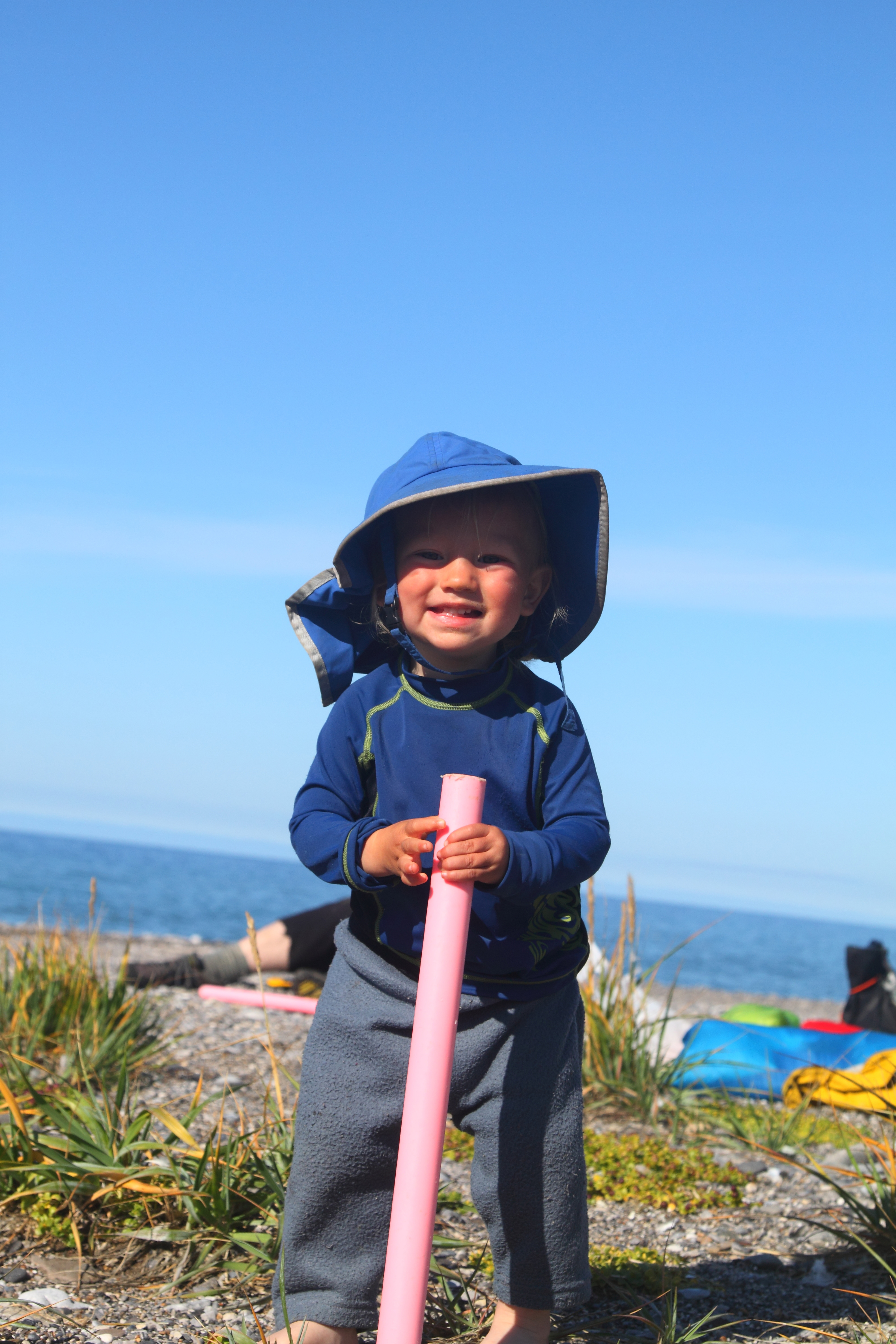 On beach with my pink walk stick