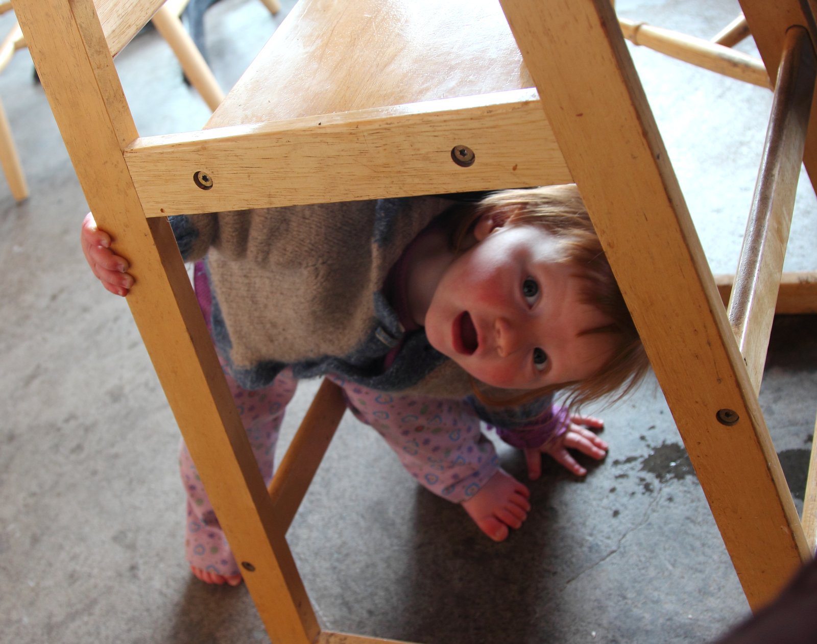 Lituya peeking from under her high chair