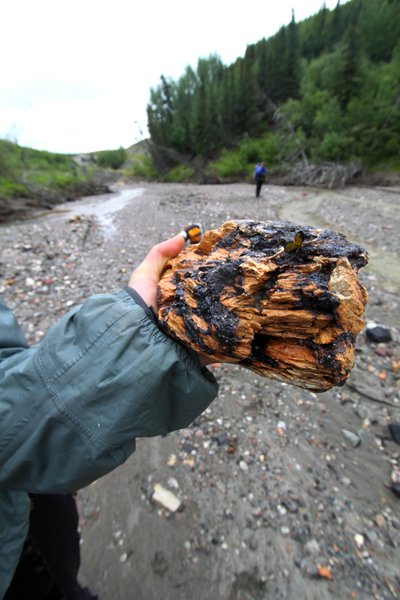 — This rock is partially melted and stained red and black, probably by a natural coal fire in a seam near it.