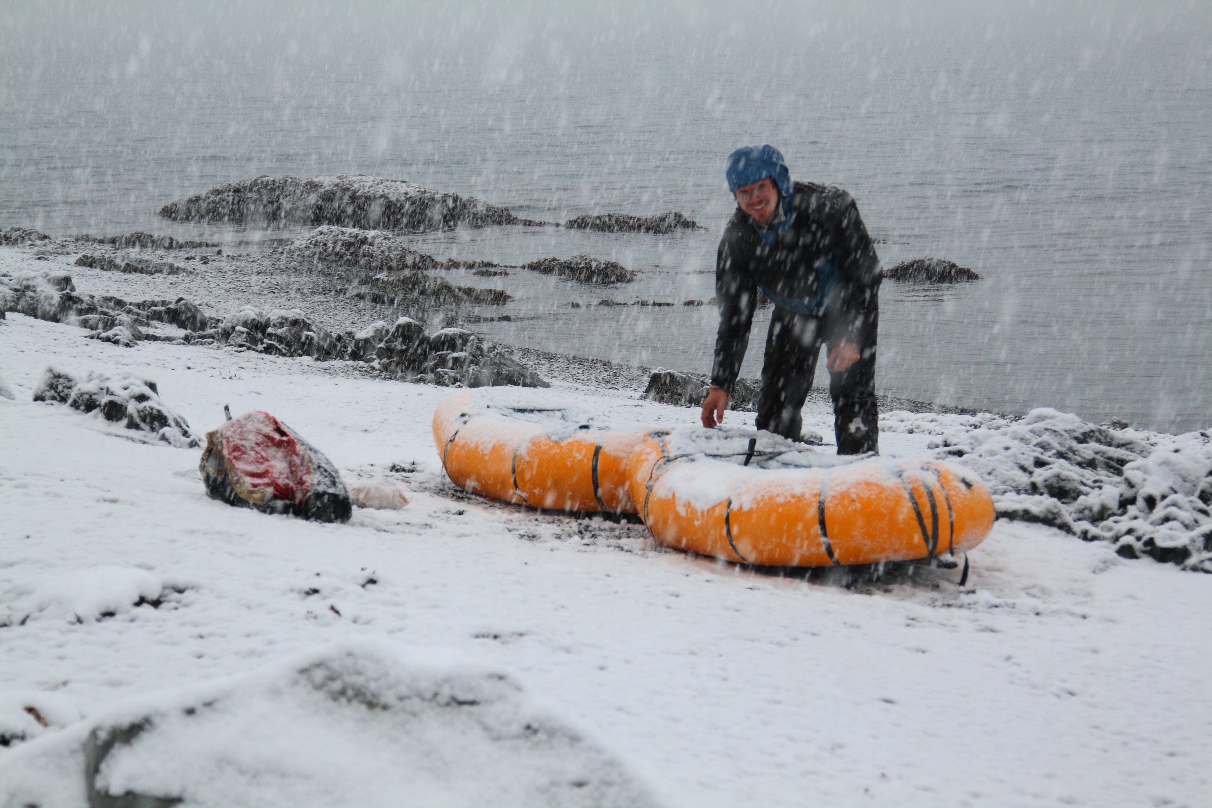 Attaching our two packrafts to a spruce pole to make a longboat - ready to make our way to Valdez on a cold December ocean.