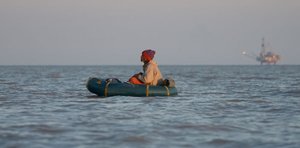 Packrafting in Cook Inlet with distant oil rig in background
