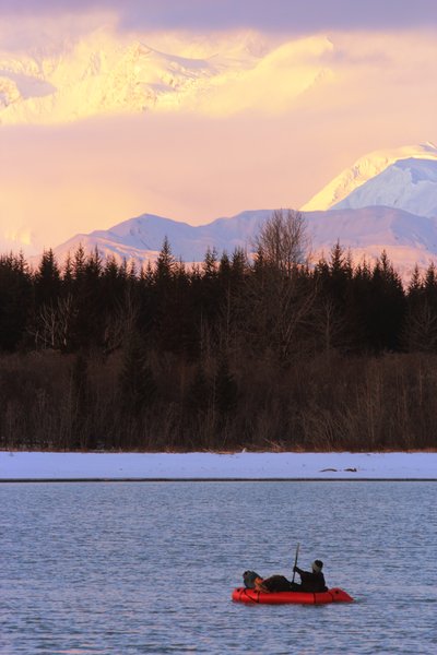— Our Alpacka "double duck" raft was enough for the whole family and gear - sometimes 450 lbs in one shot. Here I'm paddling with Katmai and our two packs.