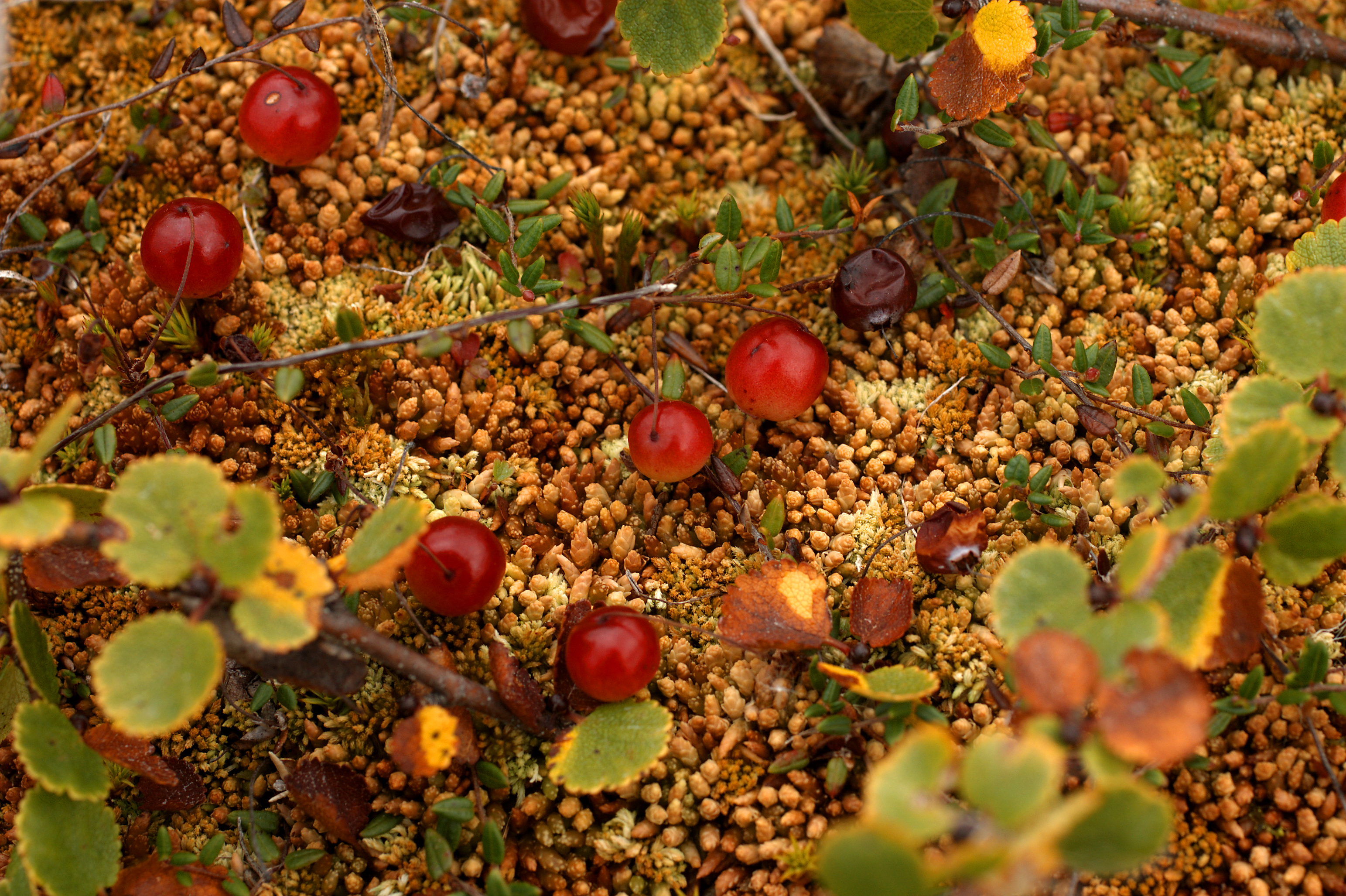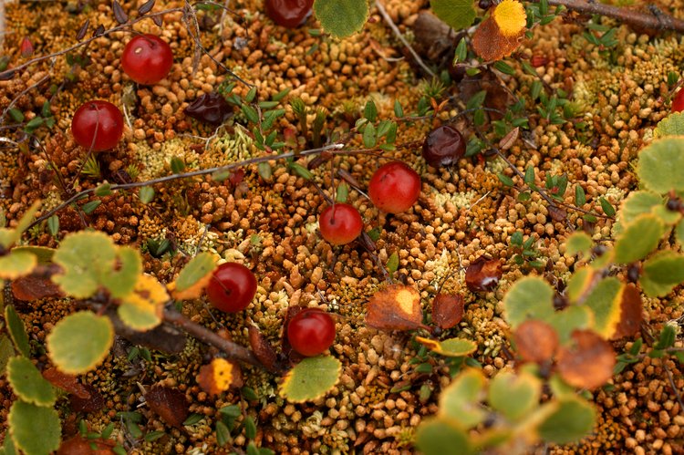 — Bog cranberries resting on a bed of sphagnum moss, framed by dwarf birch. South of Upper Talarik creek, near the proposed mine pit.