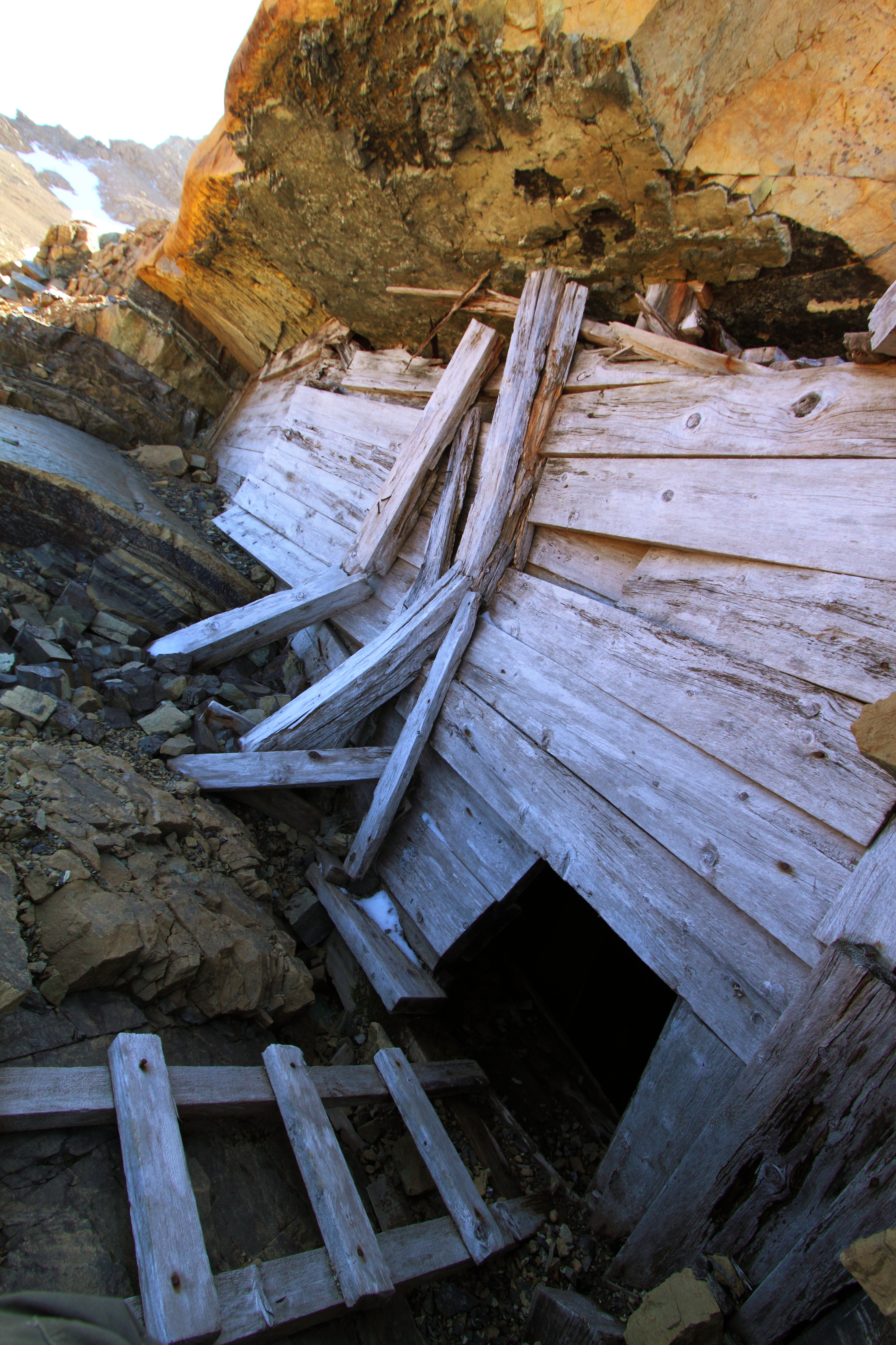 As a kid I followed this route into the mine once.  The ladder descends into darkness down a irregular shaft.  Rotten steps near the top are followed by stronger wood below where cold still air has preserved them.