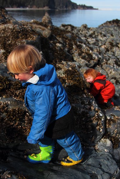Lituya tries to catch up to Katmai on the slippery boulders