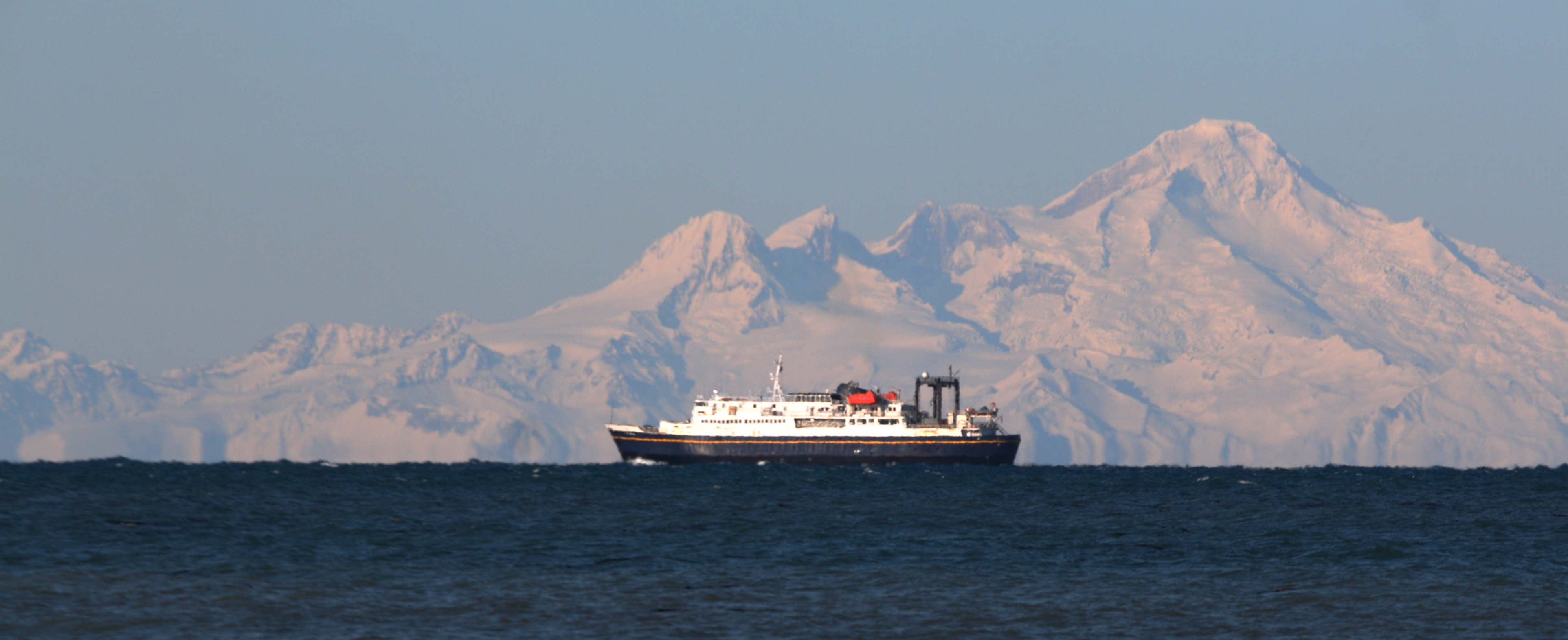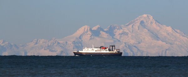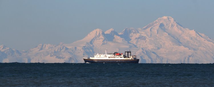 — The state ferry passes in front of Mt. Iliamna on its way to Seldovia