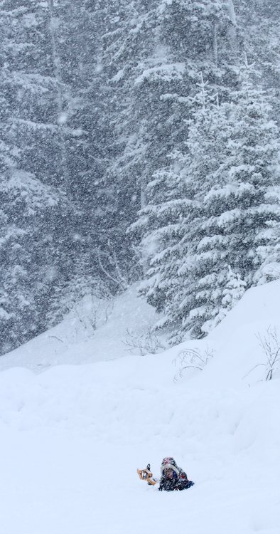 Nearly disappearing in the snow on the side of the road, Katmai plays.