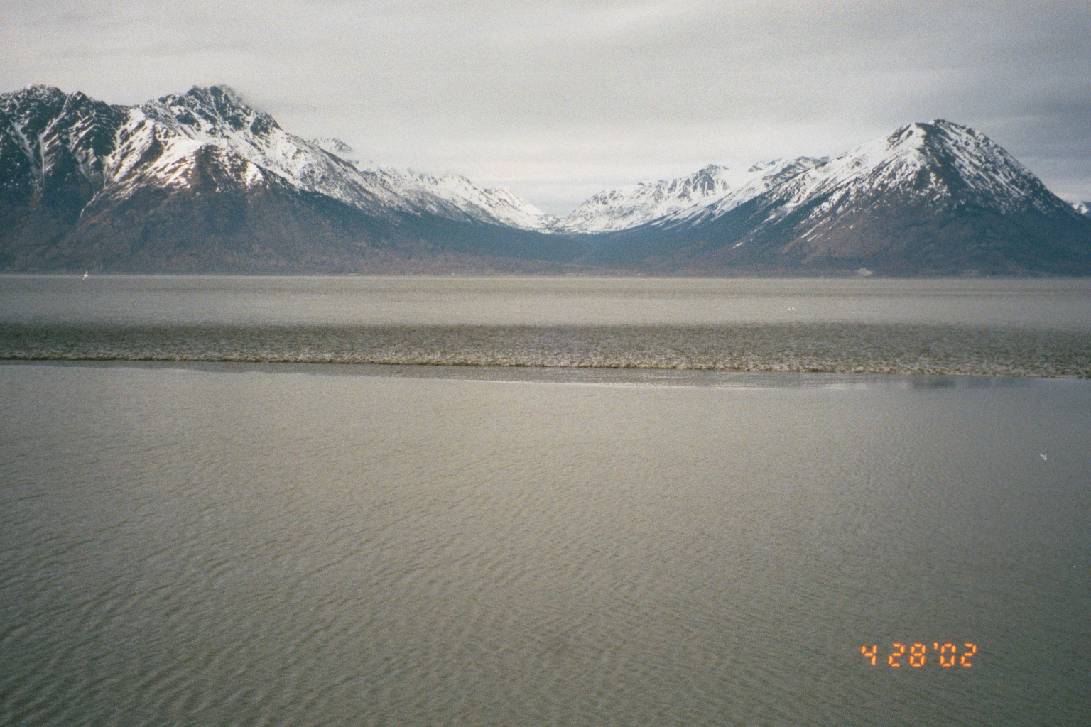 — This is the first in a sequence of photos of the April 28 Bore running up the beach. The Bore is crossing a dry sandbar into a shallow pool near the shore. This photo looks north across the arm.