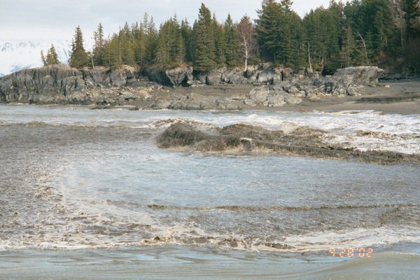— Photo 6 - the reflected bore is advancing slowly and violently against the inrushing current. Note how sediment-rich the water is at this point.
