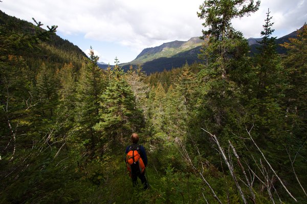 — This forested branch of Tutka Valley was on average quite low-angle. But hidden beneath the smooth trees were small but impassable cliffs between stretches of flat. We wound through, from shadowed forest to sunlit meadow. Moose tracks dented the moss, and bear droppings laced with plant fiber and berry seeds decorated faint trails. Amongst thousands of luntz (sitka-white hybrid) spruce we found a handfull of young mountain hemlock sprouting next to wet meadows. The forest was a detailed mystery.