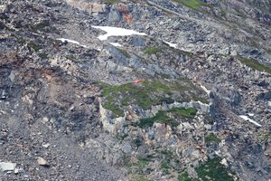 — A helicopter perches in the middle of bedrock fragmented by its slow creep toward the retreating Portage Glacier.