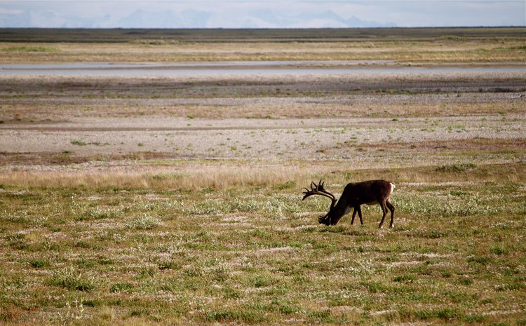 Caribou (<em>Rangifer tarandus<?em>) grazing lichen on the coastal plain.