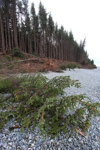 It appears that this storm was the most erosive in about 5 years. Google images from 5 years earlier show a several meter wide band of trees separates the beach from a river (59.705140, -140.490520) which was intact before the storm, but was breached by the storm.