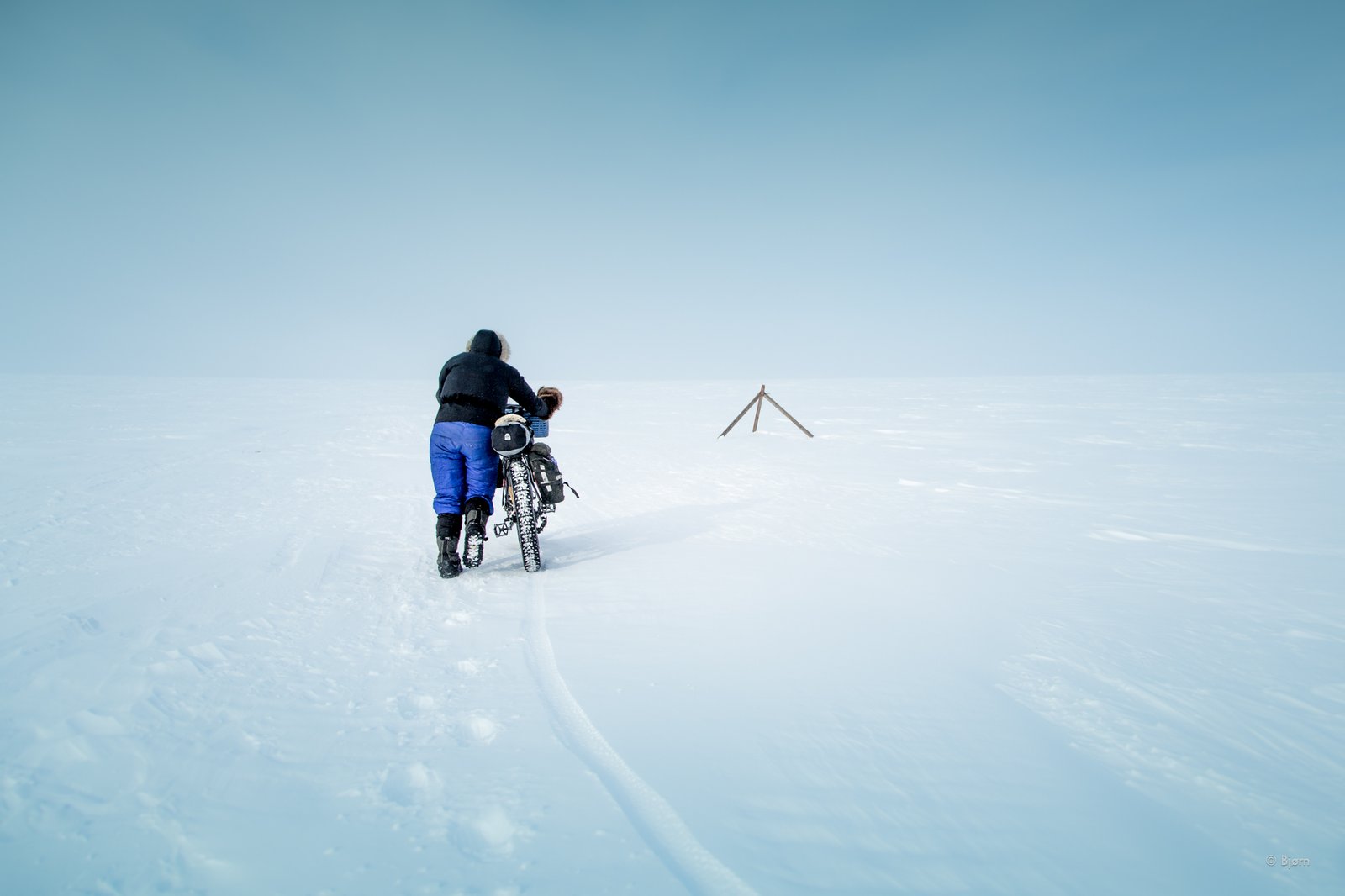 — Bjørn and Kim are thankful for tripod markers in an otherwise world of all white.