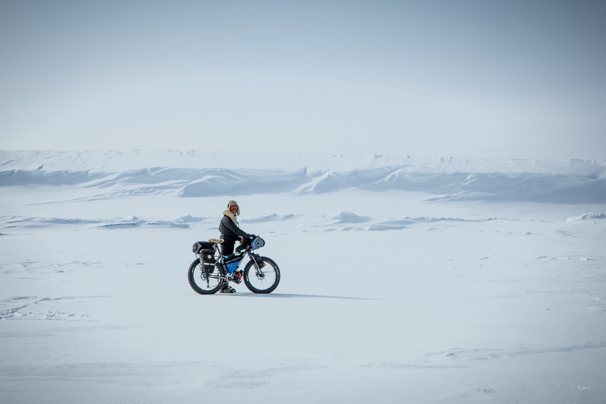 — Post holing along the shore of Kobuk Lake. After the storm passed, Bjørn and Kim had tough and slow going through all the new wind-driven snow.