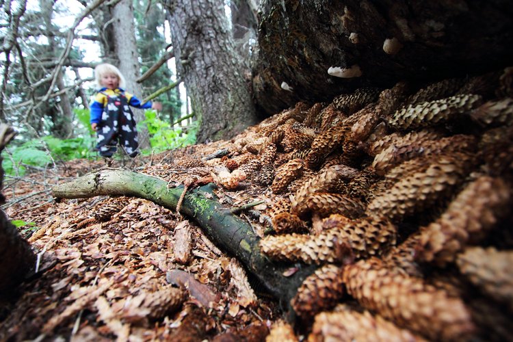 — Playing in the treasure trove of spruce cones stored by squirrels.