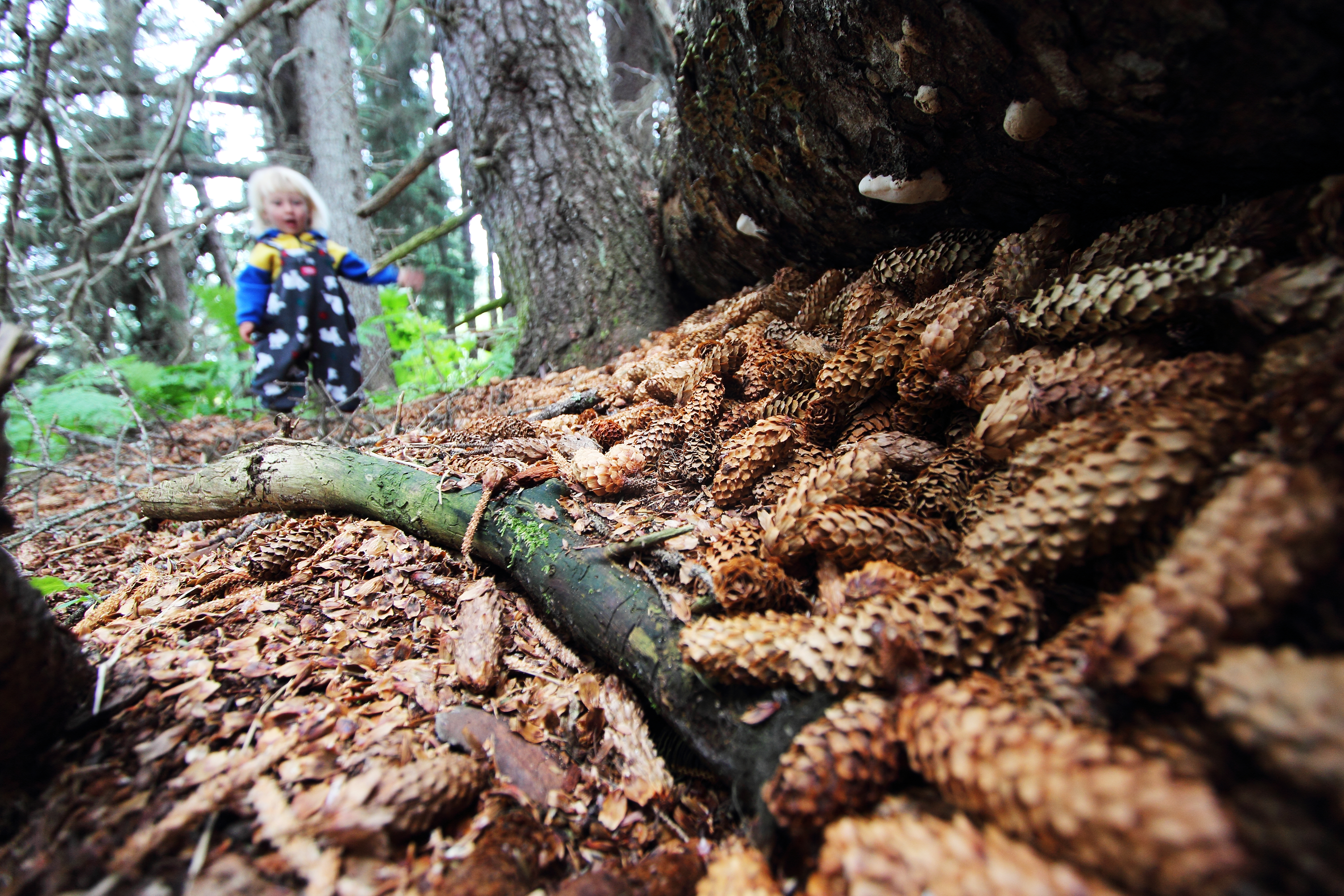 Playing in the treasure trove of spruce cones stored by squirrels.
