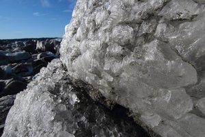 — Ice will melt more readily at crystal boundaries, and along discontinuities in the crystal, so if ice has been exposed to sun for a while it reveals the fist-sized and larger crystals that make up the berg.