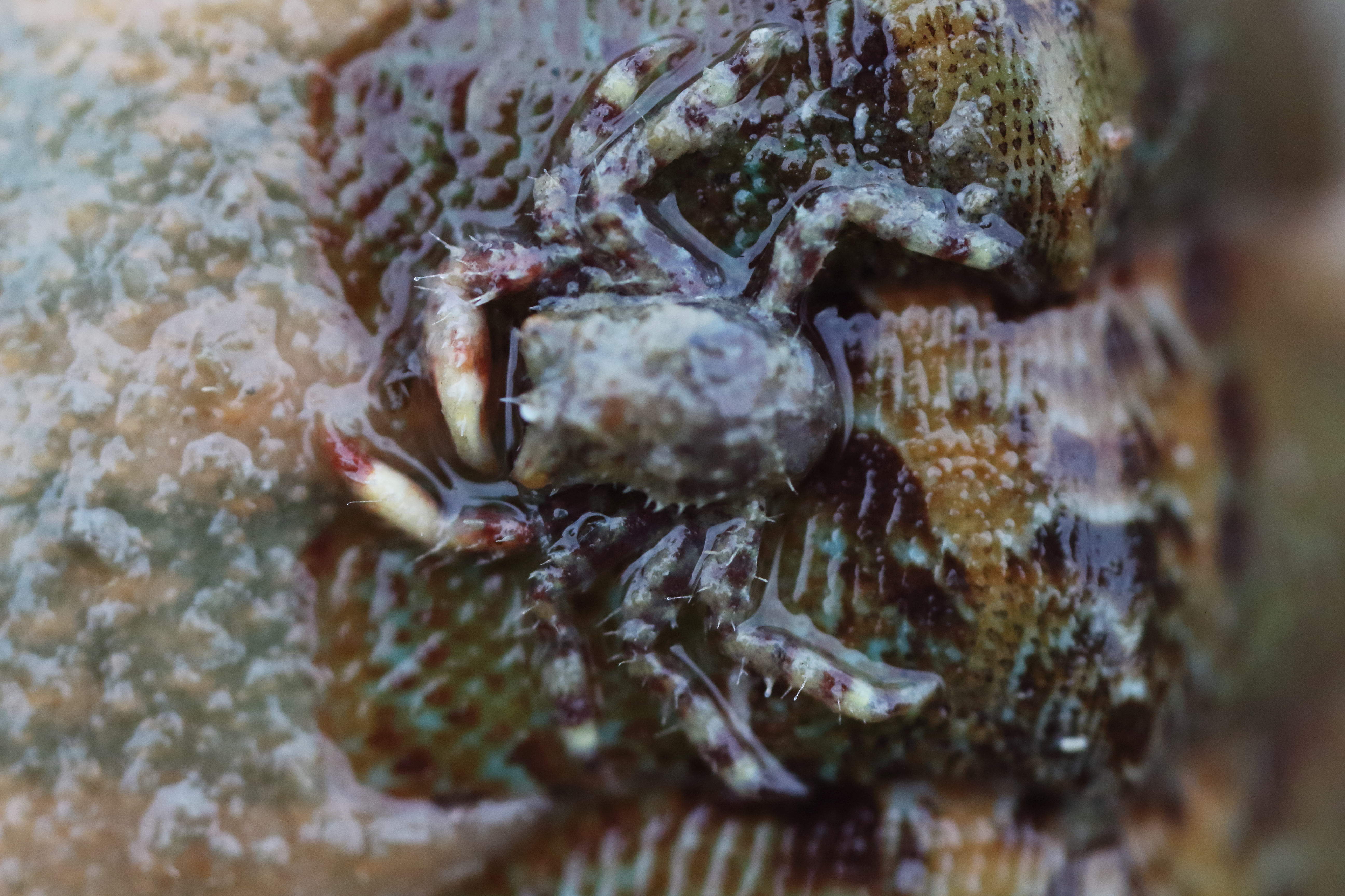 A miniscule hairy crab hides on the back of a chiton.