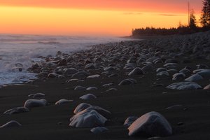 Boulders and sand in the surf of what was once Sitkagi Bluffs.