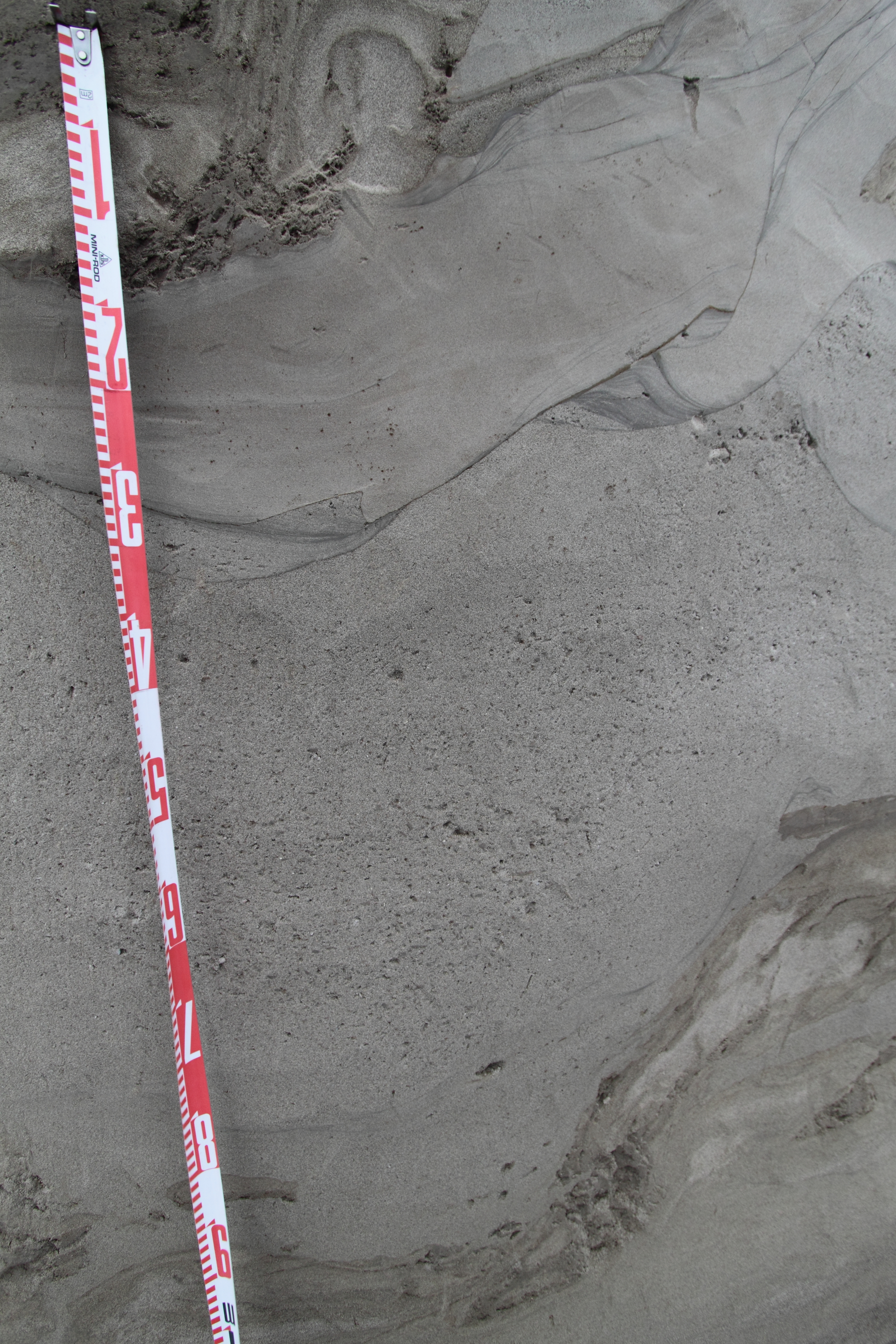 — At the bottom of the photo, deformed lake sediments are broken and floating in the homogenized sediment. The roughness of the homogenous looking sediment is because there are numerous tiny mud-balls (rip-ups) in the sand, a feature also seen in the surface deposit from this liquefaction event. Above that are feathery elutriation structures that likely formed as water escaped from the liquefied sediment. And at the very top you can see the upper edge of the liquefied layer, where the overlying layer is broken and intruded.