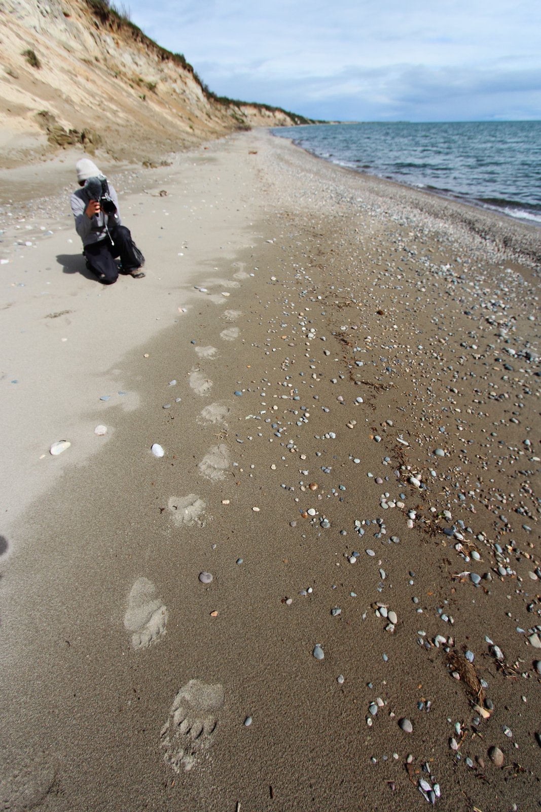 — Hanna Craig of Media Action Project takes b-roll film showing bear tracks on Lake Iliamna.