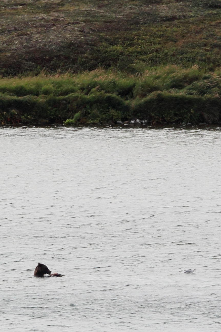 — A bear hangs out in the middle of a kettle pond, catching fish.