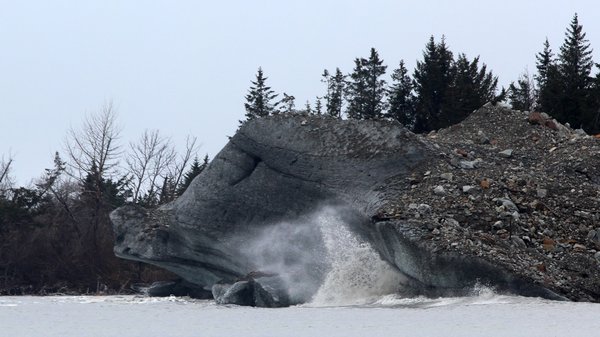 — At Malapsina's Sitkagi Lagoon, this giant iceberg situated itself near the outlet to the ocean, where surges that overtopped the moraine broke against its front. The trees behind the berg are growing on rapidly melting glacial ice.