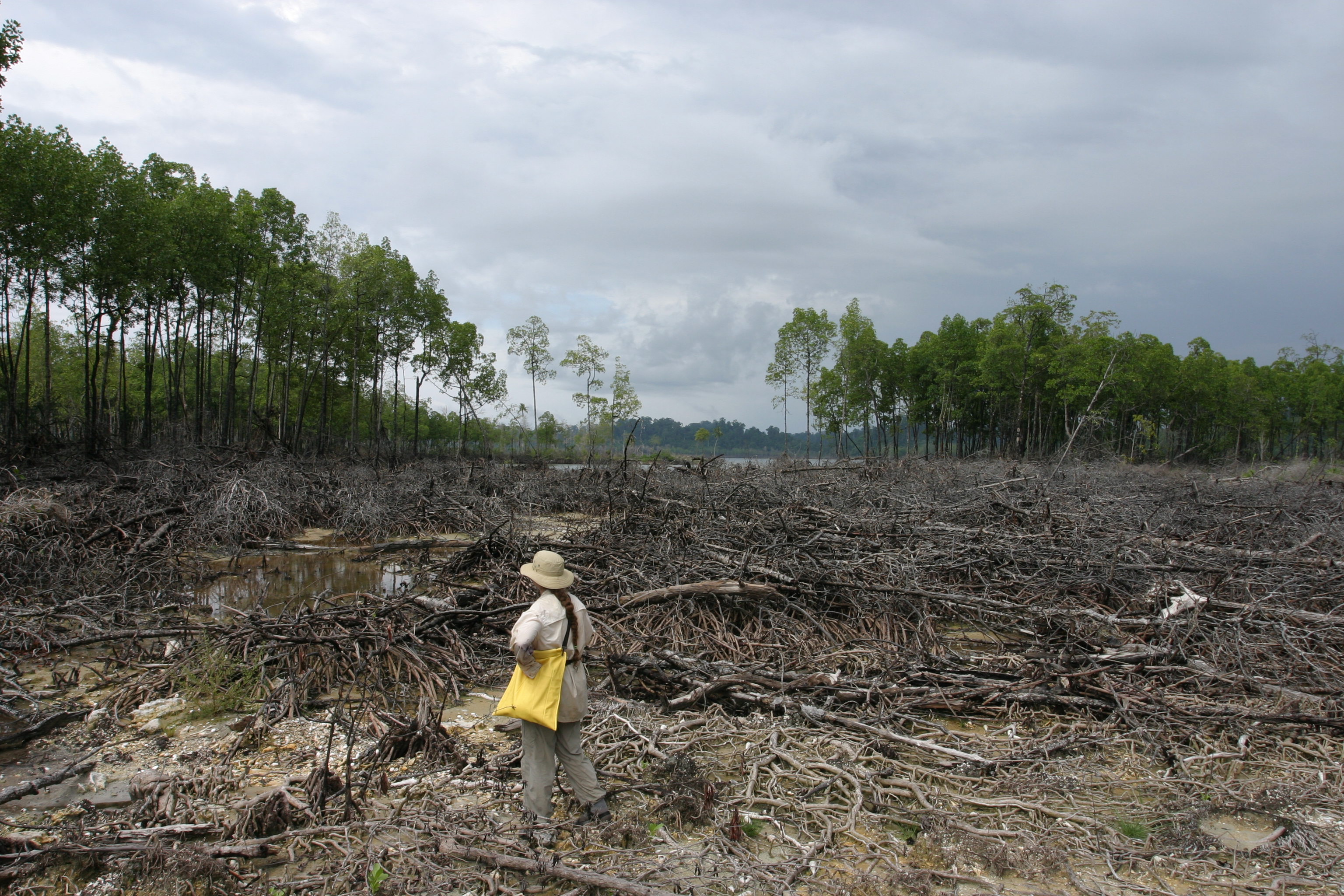 — At the northwest end of Simeulue Island off Sumatra, the 26 December 2004 tsunami flooded coastal mangroves, then withdrew violently and flattened them. Lori Dengler of Humboldt State University in California surveys the damage in April 2005.