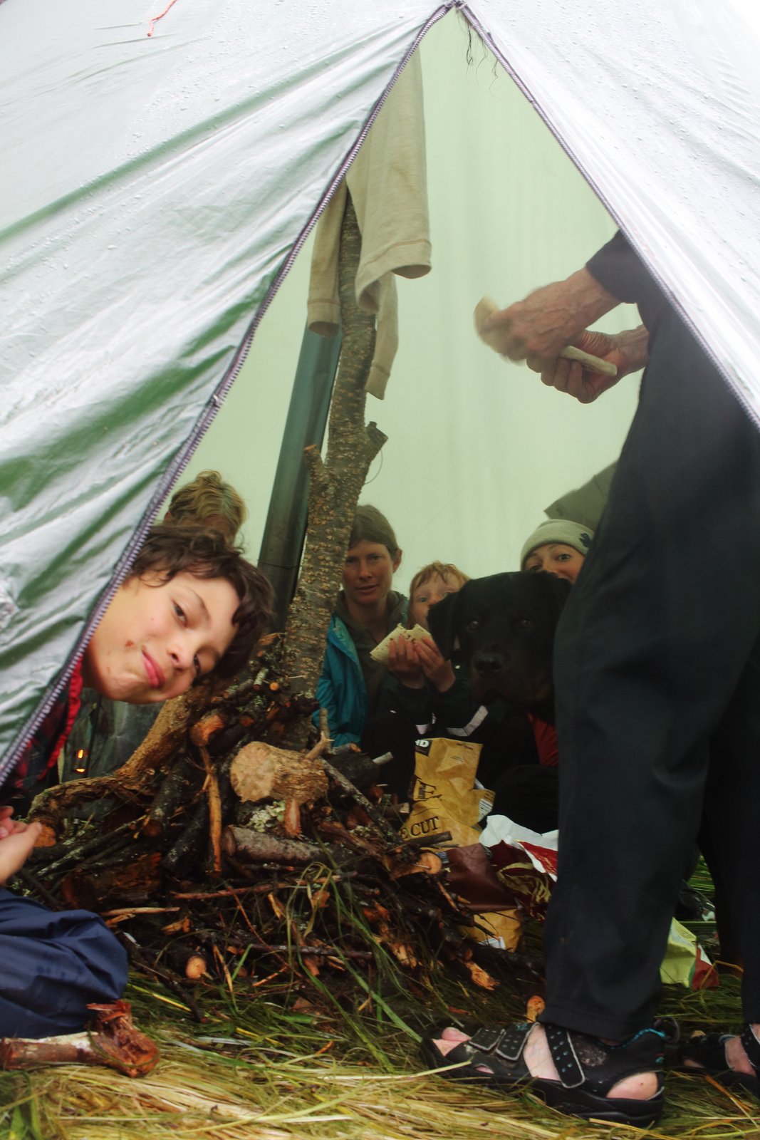 — Trail volunteers hiding out in a gear tent warmed by a little titanium wood stove.