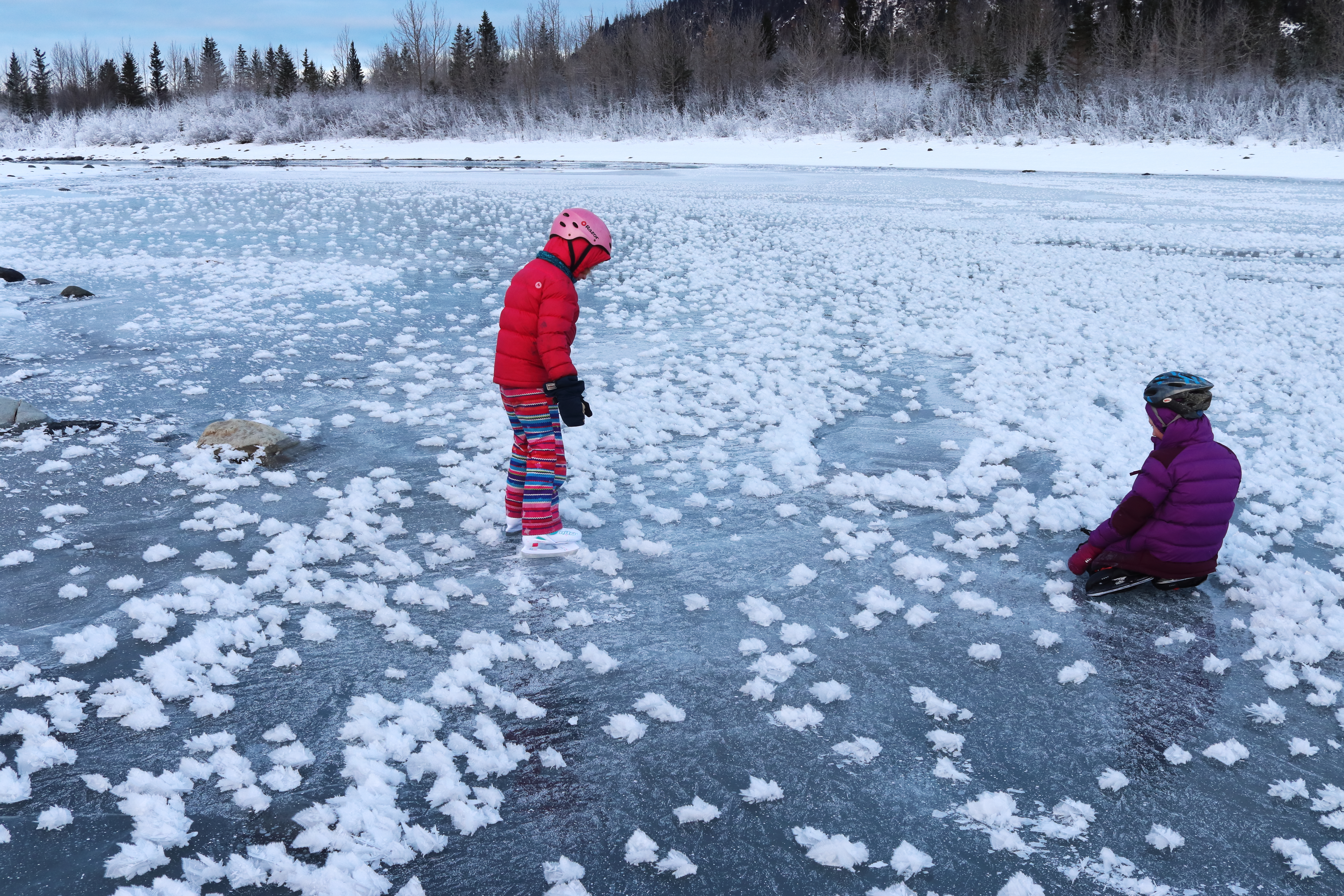 We discussed this at some length, and the best theory we came up with is that two things are combining here. The first is that the crystals in the lake ice here grew horizontally. Frost growing on top will tend to be aligned with those crystals, and because they're horizontal that doesn't work out. The second might be that once a frost crystal grows in the relatively still air, it will tend to pull water molecules out of the air before they can reach the ice surrounding it. This is similar to how certain rocks grow extraordinarily large crystals when there is a process to inhibit crystal nucleation.