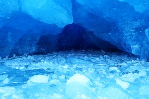 — Across shattered and refrozen ice is the entrance to a cave into the interior of Grewingk Glacier.