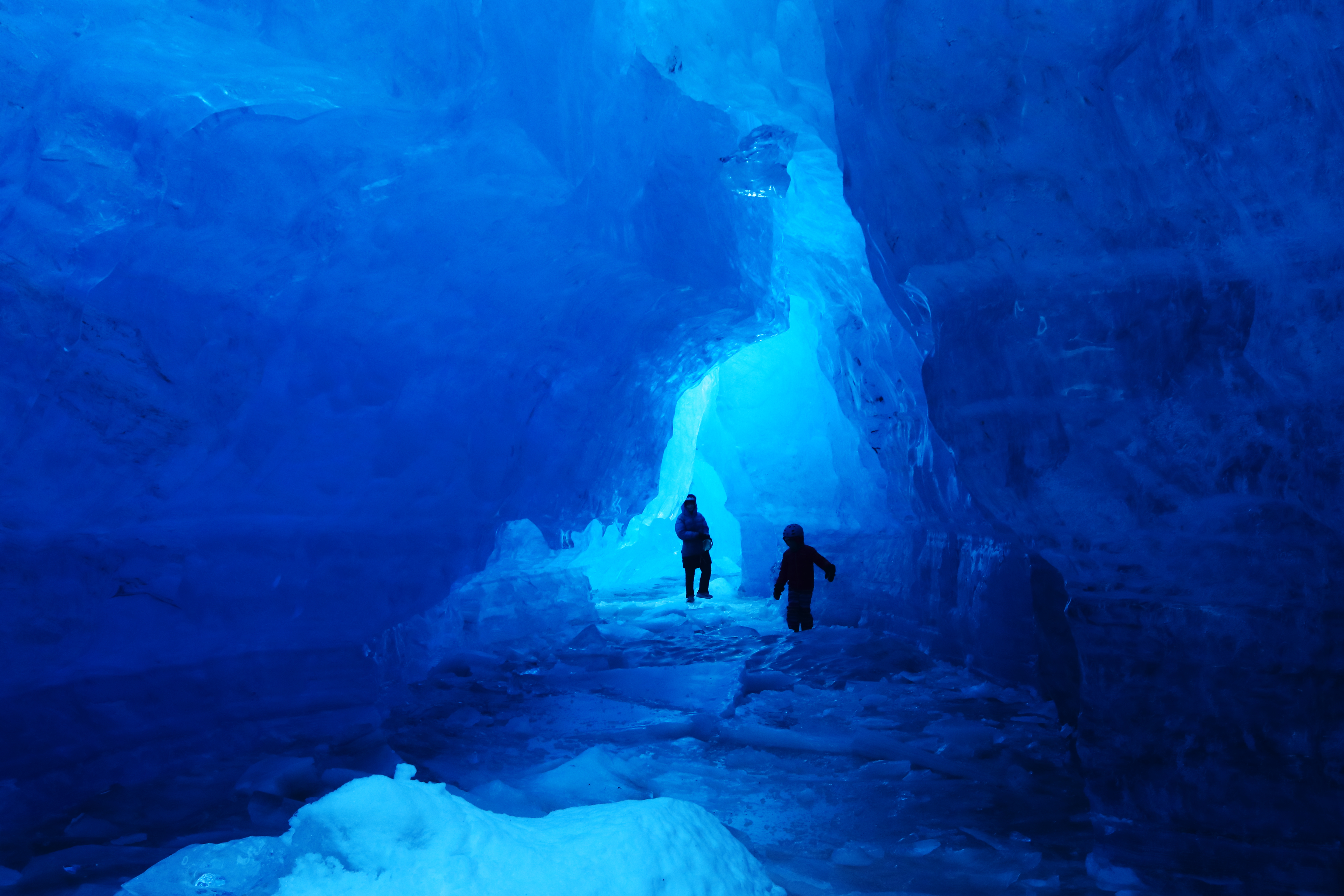 It turns out the answer is very simple: Ice is blue. We think of it as clear or white because we encounter it when it's thin so the blue color is hard to see, or when it has bubbles or other surfaces that reflect white light, creating that snowy whiteness. But if you have enough ice, with few enough bubbles, then you can really see that blue color come through.