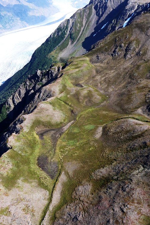 A dry pond appears to have cracks in it, running parallel to nearby cliffs.