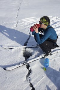 — Kate stopping to sip some water from a crack created by a pressure ridge in Lake Iliamna