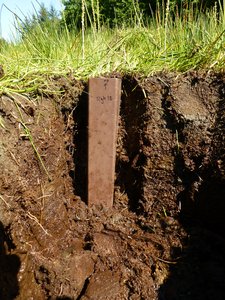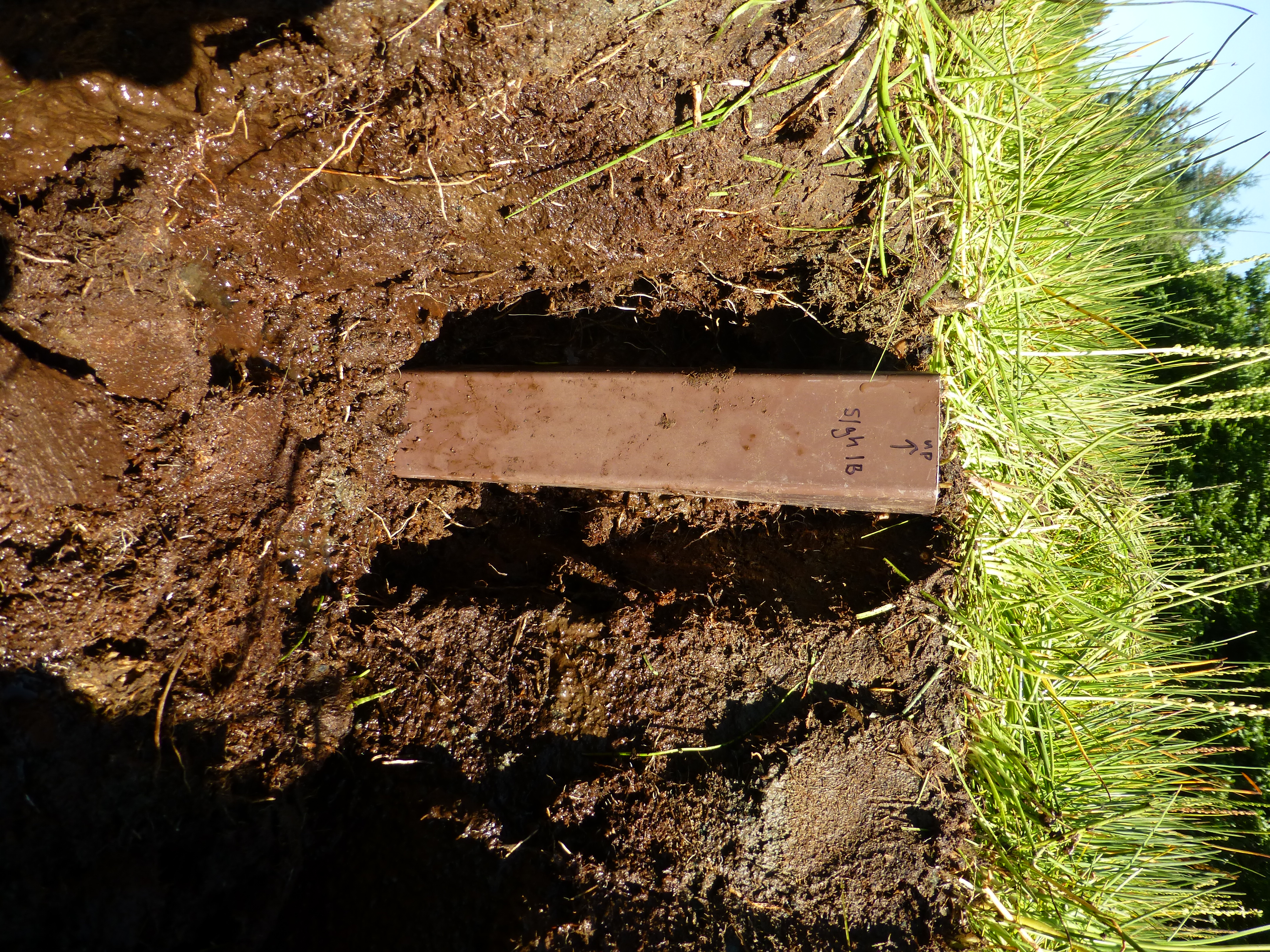 — To collect a sample of peat, Hig carved the side of a small pit into a boxy shape that a drain-pipe could be fit around. After labeling it, he cut the back of the peat and removed the whole sample intact.