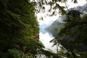 — Looking along the length of Bear Lake from thick forest along its shore.