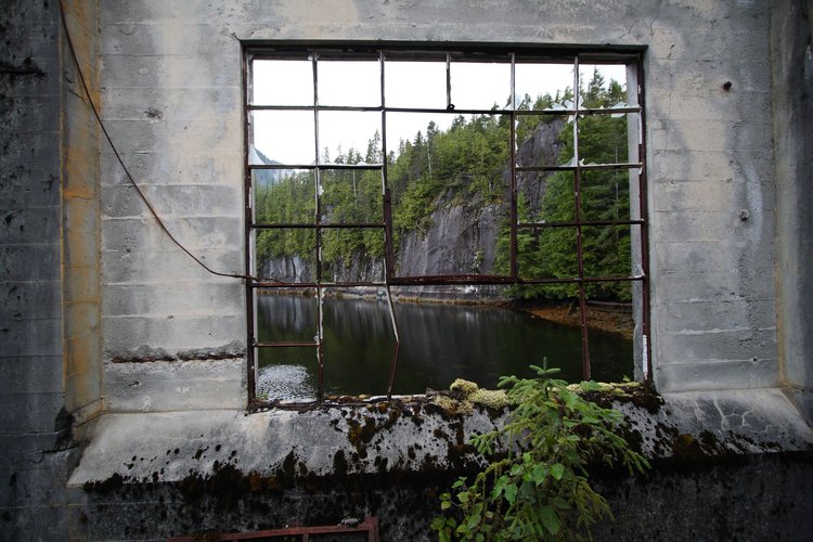 — Looking out a window on a mine building. Trees grow inside as well as out, since the roof long ago collapsed.